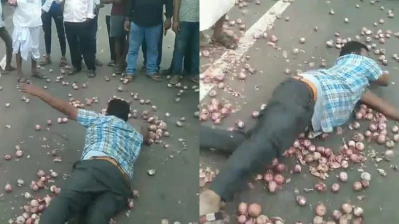 ಈರುಳ್ಳಿ ದರ ತೀವ್ರ ಕುಸಿತ ಹಿನ್ನೆಲೆ ವಿಜಯಪುರ ಜಿಲ್ಲೆಯ ಕೊಲ್ಹಾರ ತಾಲ್ಲೂಕಿನ ಕುಪಕಡ್ಡಿ ಕ್ರಾಸ್ ಬಳಿ ರಾಷ್ಟ್ರೀಯ ಹೆದ್ದಾರಿ 52 ರಲ್ಲಿ ರೈತರು ಈರುಳ್ಳಿ ರಾಶಿ ಸುರಿದು ಪ್ರತಿಭಟನೆ ಮಾಡಿದ್ದಾರೆ. ಕುಪಕಡ್ಡಿ ಬಳಿಯ ತೋಟಗಾರಿಕೆ ಎಫ್ಪಿಒ ಆವರಣದಲ್ಲಿ ಈರುಳ್ಳಿ ಸುರಿದು ಪ್ರತಿಭಟನೆ ಮಾಡಲಾಗಿದೆ. ಉತ್ತಮ ಗುಣಮಟ್ಟದ ಈರುಳ್ಳಿ ಕ್ವಿಂಟಾಲ್ಗೆ ಕೇವಲ 200 ರೂಪಾಯಿಗೆ ಹರಾಜಾಗುತ್ತಿದೆ. ಕಡಿಮೆ ದರಕ್ಕೆ ಹರಾಜಾದ ಕಾರಣ ಈರುಳ್ಳಿ ಬೆಳೆಗಾರರು ತೀವ್ರ ಅಸಮಾಧಾನ ವ್ಯಕ್ತಪಡಿಸಿದ್ದಾರೆ. ರಾಷ್ಟ್ರೀಯ ಹೆದ್ದಾರಿ ಮೇಲೆ ಈರುಳ್ಳಿ ಸುರಿದು ಬಿದ್ದು ಮಲ್ಲಿಕಾರ್ಜುನ ಬೋಲಗೊಂಡ ಎಂಬ ರೈತ ಹೊರಳಾಡಿದ್ದಾರೆ. ಇದೇ ಈರುಳ್ಳಿ ಬಾಗಲಕೋಟೆಯಲ್ಲಿ ಕ್ವಿಂಟಾಲ್ಗೆ 1000 ರೂಪಾಯಿಗೆ ಮಾರಾಟವಾಗಿತ್ತು. ಡಿಎಪಿ ರಸಗೊಬ್ಬರ 1200 ರೂ., ಯೂರಿಯಾ 300 ರೂ. ಇದೆ. ನಾವು ಕಷ್ಟಪಟ್ಟು ಬೆಳೆದ ಈರುಳ್ಳಿಗೆ ಕೇವಲ 200 ರೂ. ಯಾಕೆಂದು ಪ್ರಶ್ನೆ ಮಾಡಿದ್ದಾರೆ. ಸಿಎಂ ಸಿದ್ದರಾಮಯ್ಯ ಈ ಕುರಿತು ಗಮನ ಹರಿಸಬೇಕೆಂದು ಆಕ್ರೋಶ ವ್ಯಕ್ತಪಡಿಸಿದ್ದಾರೆ