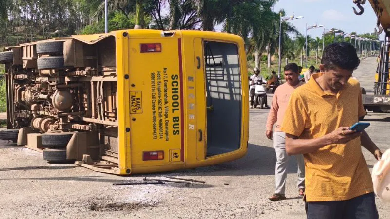 ನೆಲಮಂಗಲ: ವಿವಿಧ ಗ್ರಾಮಗಳಿಂದ ಪುಟಾಣಿ ಮಕ್ಕಳನ್ನ ಪಿಕ್ ಮಾಡಿ ಶಾಲೆಗೆ ಬರುವ ಸಂರ್ಭದಲ್ಲಿ ಶಾಲಾ ಬಸ್ ಚಾಲಕನ ನಿರ್ಲಕ್ಷ್ಯದಿಂದ ಒಂದು ಶಾಲಾ ವಾಹನ ಪಲ್ಟಿಯಾದ ಪರಿಣಾಮ ಮಕ್ಕಳಿಗೆ ಸಣ್ಣಪುಟ್ಟ ಗಾಯಗಳಾದ ಘಟನೆ ಬೆಂಗಳೂರು ಹೊರವಲಯ ನೆಲಮಂಗಲ ಉಪವಿಭಾಗದ ಮಾದನಾಯಕನಹಳ್ಳಿ ಪೊಲೀಸ್ ಠಾಣಾ ವ್ಯಾಪ್ತಿಯಲ್ಲಿ ನಡೆದಿದೆ.