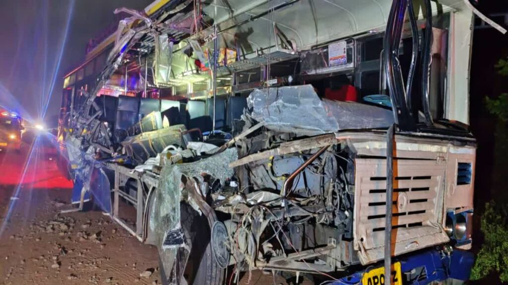 ತಿರುಪತಿಯಿಂದ ಬೆಂಗಳೂರಿನತ್ತ ಆಂಧ್ರಪ್ರದೇಶದ ಬಸ್ ಬರುತ್ತಿತ್ತು. ಈ ವೇಳೆ ಚಾಲಕ ಓವರ್ಟೇಕ್ ಮಾಡಲು ಮುಂದಾಗಿದ್ದು, ಲಾರಿಗೆ ಬಸ್ ಡಿಕ್ಕಿ ಹೊಡೆದಿದೆ. ಡಿಕ್ಕಿ ರಭಸಕ್ಕೆ ಬಸ್ನ ಮುಂಭಾಗ ಮತ್ತು ಒಂದು ಬದಿ ಸಂಪೂರ್ಣ ಜಖಂ ಆಗಿದೆ. ಘಟನೆಯಲ್ಲಿ ಬಸ್ನಲ್ಲಿದ್ದ ಕೇಶವರೆಡ್ಡಿ (44), ತುಳಸಿ (21), ಪ್ರಣತಿ (4) ಹಾಗೂ 1 ವರ್ಷದ ಮಗು ಸಾವನ್ನಪ್ಪಿದ್ದಾರೆ. ಘಟನೆಯಲ್ಲಿ ಇತರ 16 ಮಂದಿ ಪ್ರಯಾಣಿಕರು ಗಾಯಗೊಂಡಿದ್ದು, ಇಬ್ಬರ ಸ್ಥಿತಿ ಗಂಭೀರವಾಗಿದೆ.