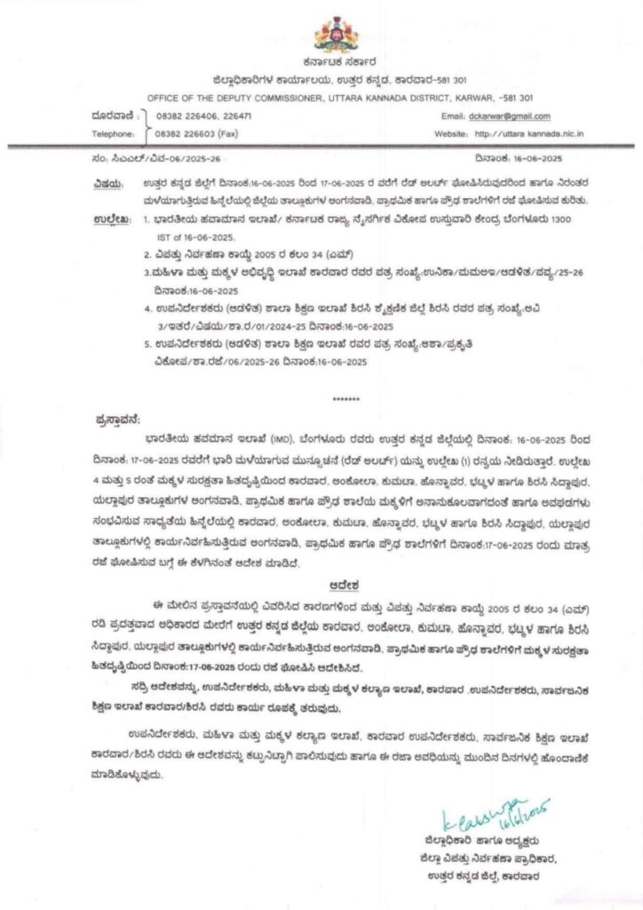 ಉತ್ತರ ಕನ್ನಡ ಜಿಲ್ಲೆಯಲ್ಲಿ ವ್ಯಾಪಕ ಮಳೆಯಾಗುತ್ತಿದ್ದು, ಮುಂಜಾಗ್ರತಾ ಕ್ರಮವಾಗಿ ನಾಳೆ ಅಂದರೆ ಜೂ.,17 ರಂದು ಉತ್ತರ ಕನ್ನಡ ಜಿಲ್ಲೆಯ, ಕಾರವಾರ, ಅಂಕೋಲಾ, ಕುಮಟಾ, ಹೊನ್ನಾವರ, ಭಟ್ಕಳ, ಶಿರಸಿ ,ಸಿದ್ದಾಪುರ, ಯಲ್ಲಾಪುರ ತಾಲೂಕಿನಲ್ಲಿರುವ ಅಂಗನವಾಡಿ, ಪ್ರಾಥಮಿಕ ಹಾಗೂ ಪ್ರೌಢಶಾಲೆಗಳಿಗೆ ರಜೆ ಘೋಷಿಸಿ ಜಿಲ್ಲಾಡಳಿತ ಆದೇಶ ಹೊರಡಿಸಿದೆ.