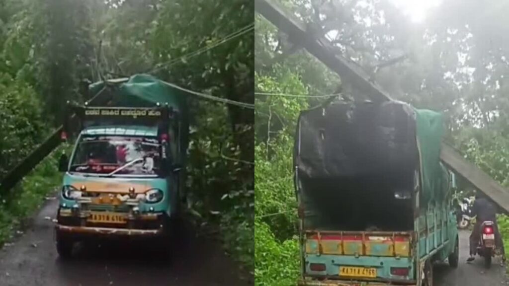 ಕಾರವಾರ(ಉತ್ತರ ಕನ್ನಡ): ಮುಂಡಗೋಡ ತಾಲೂಕಿನ ಬೆಡಸಗಾಂವ್ ಗ್ರಾಮದಲ್ಲಿ ದೊಡ್ಡ ಅನಾಹುತವೊಂದು ಕೂದಲೆಳೆ ಅಂತರದಲ್ಲಿ ತಪ್ಪಿದೆ. 10ಕ್ಕೂ ಹೆಚ್ಚು ಕಾರ್ಮಿಕರನ್ನು ಕರೆದೊಯ್ಯುತ್ತಿದ್ದ ವಾಹನದ ಮೇಲೆ ವಿದ್ಯುತ್ ಕಂಬ ಮುರಿದು ಬಿದ್ದಿದೆ. ಆದರೆ ಯಾವುದೇ ಪ್ರಾಣಹಾನಿ ಸಂಭವಿಸಿಲ್ಲ.
