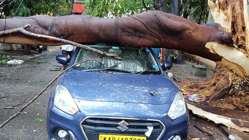 ಕಾರಿನ ಮೇಲೆ ಬಿದ್ದ ಬೃಹತ್ ಮರ; ಚಾಲಕ ಗ್ರೇಟ್ ಎಸ್ಕೇಪ್