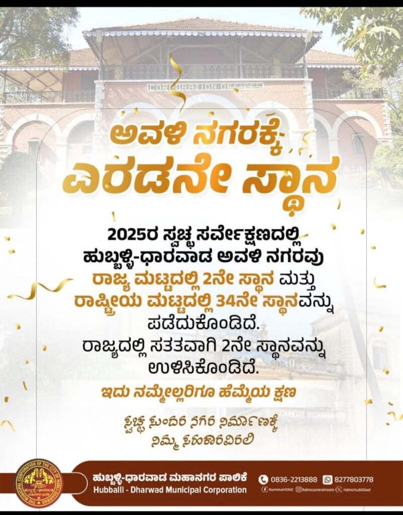 ಹುಬ್ಬಳ್ಳಿ: ಸ್ವಚ್ಛ ಭಾರತ್ ಮಿಷನ್ನಡಿ ಕೇಂದ್ರೀಯ ವಸತಿ ಮತ್ತು ನಗರ ವ್ಯವಹಾರಗಳ ಸಚಿವಾಲಯ ನಡೆಸಿದ ಸ್ವಚ್ಛ ಸರ್ವೇಕ್ಷಣ-2025ರಲ್ಲಿ ಹುಬ್ಬಳ್ಳಿ-ಧಾರವಾಡ ಮಹಾನಗರ ಗಣನೀಯ ಸಾಧನೆ ಮಾಡಿದ್ದು, ರಾಜ್ಯದ ಎರಡನೇ ಸ್ವಚ್ಚ ನಗರ ಎಂಬ ಕೀರ್ತಿಗೆ ಪಾತ್ರವಾಗಿದೆ.