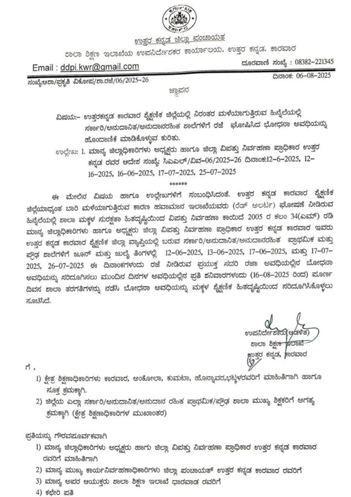 ಉತ್ತರ ಕನ್ನಡ ಕಾರವಾರ ಶೈಕ್ಷಣಿಕ ಜಿಲ್ಲೆಯಾದ್ಯಂತ ಭಾರಿ ಮಳೆಯಿಂದಾಗಿ ಹವಾಮಾನ ಇಲಾಖೆಯು (ರೆಡ್ ಅಲರ್ಟ್) ಘೋಷಣೆ ನೀಡಿತ್ತು. ಇದರ ಹಿನ್ನೆಲೆಯಲ್ಲಿ ವಿದ್ಯಾರ್ಥಿಗಳ ಸುರಕ್ಷತೆಯ ದೃಷ್ಟಿಯಿಂದ ಜಿಲ್ಲಾಧಿಕಾರಿಗಳು ಮತ್ತು ಜಿಲ್ಲಾ ವಿಪತ್ತು ನಿರ್ವಹಣಾ ಪ್ರಾಧಿಕಾರದ ಅಧ್ಯಕ್ಷರು, 2005ರ ವಿಪತ್ತು ನಿರ್ವಹಣಾ ಕಾಯ್ದೆಯ ಕಲಂ 34(ಎಮ್) ಅಡಿಯಲ್ಲಿ ಶಾಲೆಗಳಿಗೆ ರಜೆ ಘೋಷಿಸಿದ್ದರು.