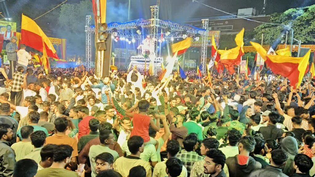 ಬೆಳಗಾವಿ: ಗಡಿನಾಡು ಬೆಳಗಾವಿಯಲ್ಲಿ ಮಧ್ಯರಾತ್ರಿಯೇ ಕನ್ನಡ ರಾಜ್ಯೋತ್ಸವದ ಸಂಭ್ರಮ ಜೋರಾಗಿ ಅಲೆಮಾಲೆಯಾಯ್ತು. ನಗರದ ಚೆನ್ನಮ್ಮ ವೃತ್ತದಲ್ಲಿ ನಡೆದ ಆಚರಣೆಗೆ ಜಿಟಿಜಿಟಿ ಮಳೆಯೂ ಅಡ್ಡಿಯಾಗಲಿಲ್ಲ. ಸಾವಿರಾರು ಕನ್ನಡಾಭಿಮಾನಿಗಳು ಮಳೆಯಲ್ಲೇ ಕನ್ನಡ ಹಾಡುಗಳಿಗೆ ಹೆಜ್ಜೆ ಹಾಕಿ ಸಂಭ್ರಮಿಸಿದರು. ಇದೇ ಮೊದಲ ಬಾರಿಗೆ ಸಿಡಿಮದ್ದು ಸಿಡಿಸಿ ಬಾನಲ್ಲಿ ಕನ್ನಡಮ್ಮನ ಚಿತ್ತಾರ ಮೂಡಿಸಲಾಯಿತು. ಕರ್ನಾಟಕ ರಕ್ಷಣಾ ವೇದಿಕೆ (ನಾರಾಯಣ ಗೌಡ ಬಣ) ವತಿಯಿಂದ ಸಿಡಿಮದ್ದಿನ ಪ್ರದರ್ಶನ ನಡೆಯಿತು. ಮಧ್ಯರಾತ್ರಿಯ ಬಣ್ಣಬಣ್ಣದ ಬೆಳಕಿನ ಚಿತ್ತಾರ ಕನ್ನಡಿಗರ ಮನಸೆಳೆಯಿತು. ವರ್ಷದಿಂದ ವರ್ಷಕ್ಕೆ ಬೆಳಗಾವಿಯಲ್ಲಿ ಕನ್ನಡ ಹಬ್ಬದ ಜೋಷ್ ಹೆಚ್ಚಾಗುತ್ತಿದ್ದು, ಕನ್ನಡ ಧ್ವಜಗಳ ಹಾರಾಟ ಮತ್ತು ಡಿಜೆ ನೃತ್ಯಗಳಿಂದ ನಗರ ಕೆಂಪು-ಹಳದಿಯಾಗಿ ಮಿನುಗಿತು. ಯಾವುದೇ ಅಹಿತಕರ ಘಟನೆಗಳು ಆಗದಂತೆ ಪೊಲೀಸರು ಬಿಗಿ ಬಂದೋಬಸ್ತ್ ಮಾಡಿದ್ದರು.