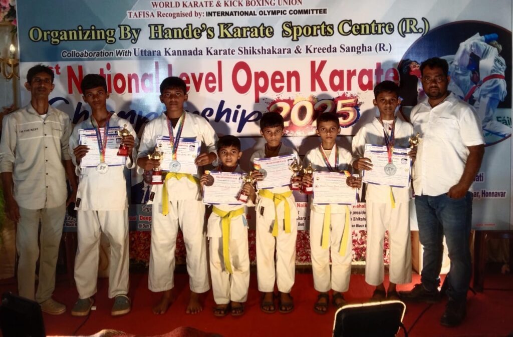 ಹೊನ್ನಾವರ: ಹೊನ್ನಾವರದ ಮೂಡಗಣಪತಿ ಸಭಾಭವನದಲ್ಲಿ ವಿಶ್ವ ಕರಾಟೆ ಮತ್ತು ಕಿಕ್ ಬಾಕ್ಸಿಂಗ್ ಯುನಿಯನ್ ತಫಿಸಾ ಅನಮೋದಿತ ಅಂತರರಾಷ್ಟ್ರೀಯ ಒಲಂಪಿಕ್ ಸಮತಿ, ಹಂದೇಸ್ ಕರಾಟೆ ಸ್ಪೋರ್ಟ್ಸ್ ಸೆಂಟರ (ರಿ)ಸಂಘಟಿತ, ಉತ್ತರ ಕನ್ನಡ ಕರಾಟೆ ಶಿಕ್ಷಕರ ಕ್ರೀಡಾ ಸಂಘದ ಸಂಯುಕ್ತಾಶ್ರಯದಲ್ಲಿ ನಡೆದ ಮೊದಲ ರಾಷ್ಟ್ರೀಯ ಮಟ್ಟದ ಓಪನ್ ಕರಾಟೆ ಚಾಂಪಿಯನ್ ಶಿಪ್ ನಲ್ಲಿ ಭಟ್ಕಳದ “Martial arts coaching centre ಕರಾಟೆ ತಂಡದ ವಿದ್ಯಾರ್ಥಿಗಳು ಅಭೂತಪೂರ್ವ ಸಾಧನೆ ಗೈದಿದ್ದಾರೆ..
