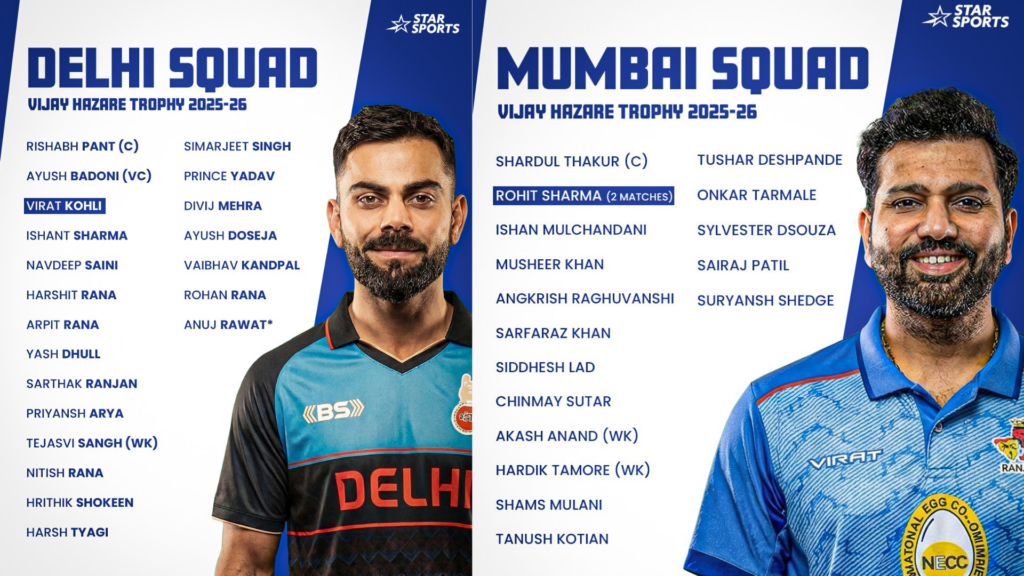 ಡಿಸೆಂಬರ್ 24 ರಿಂದ ಶುರುವಾಗಲಿರುವ ವಿಜಯ ಹಝಾರೆ ಟೂರ್ನಿಗಾಗಿ ಮುಂಬೈ ಹಾಗೂ ದೆಹಲಿ ತಂಡಗಳನ್ನು ಪ್ರಕಟಿಸಲಾಗಿದೆ. ಈ ಎರಡು ತಂಡಗಳಲ್ಲಿ ಟೀಮ್ ಇಂಡಿಯಾದ ದಿಗ್ಗಜರಾದ ರೋಹಿತ್ ಶರ್ಮಾ ಹಾಗೂ ವಿರಾಟ್ ಕೊಹ್ಲಿ ಕಾಣಿಸಿಕೊಂಡಿರುವುದು ವಿಶೇಷ.