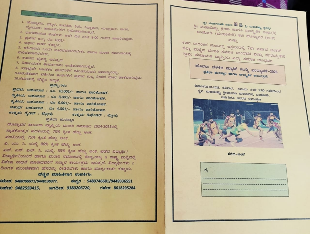 ಹೊನ್ನಾವರ ಜ.23 : ತಾಲೂಕಿನ ಖಂಡೋಡಿಯಲ್ಲಿ ಶ್ರೀ ಮಹಾವಿಷ್ಣು ಕ್ರೀಡಾ ಹಾಗೂ ಸಾಂಸ್ಕೃತಿಕ ಸಂಘ ಮತ್ತು ಊರ ನಾಗರಿಕರ ಸಂಯುಕ್ತ ಆಶ್ರಯದಲ್ಲಿ ಜ.25 ರಂದು ಮರಾಠಿ ಸಮಾಜದ ಹಾಗೂ ನಗರಬಸ್ತಿಕೇರಿ ಗ್ರಾ.ಪಂ ವ್ಯಾಪ್ತಿಯ ಎಲ್ಲಾ ಸಮಾಜ ಬಾಂಧವರಿಗಾಗಿ 7ನೇ ವರ್ಷದ ಹೊನಲು ಬೆಳಕಿನ ಮ್ಯಾಟ್ ಕಬ್ಬಡ್ಡಿ ಪಂದ್ಯಾವಳಿ ಹಾಗೂ ಪ್ರತಿಭಾ ಪುರಸ್ಕಾರ ಮತ್ತು ಸಾಂಸ್ಕೃತಿಕ ಕಾರ್ಯಕ್ರಮ ಹಮ್ಮಿಕೊಳ್ಳಲಾಗಿದೆ.